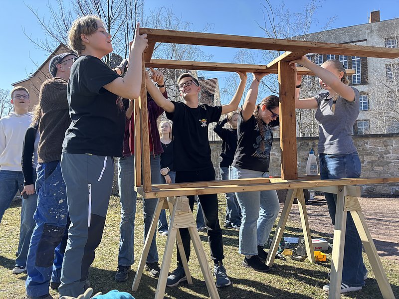 Entstanden ist er im letzten Halbjahr: Die damalige Klasse 8c hat ihn zusammen mit Herrn Weeth gebaut und nun steht er für alle bereit. Das Prinzip ist ganz einfach: