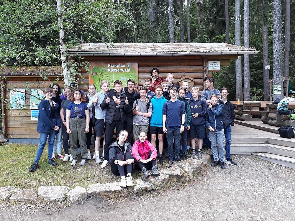 Die 9b verbrachte am 1.6.22 einen Wandertag im Kletterwald in Hohenfelden. Wir fuhren mit dem Regionalzug ungefähr 45 Minuten nach Kranichfeld und von dort aus liefen wir mit lauter Musik in Richtung Kletterwald. Nach der Ankunft gab es erstmal Frühstück. Als dann alle fertig waren, gingen wir in Richtung Einweisungsbereich. Dort bekamen wir Sicherheitsgurte und Handschuhe. Nach den Anweisungen ging es los. Es gab viele Kletterparkoure mit je einem bestimmten Schwierigkeitsgrad. Nach 2:30 h erlebnisreichem Klettern gönnten sich erstmal viele ein Eis von höchster Qualität. Zurück in Weimar ging gegen 14 Uhr ein schöner Wandertag zu Ende.