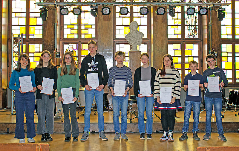Für drei von uns zahlte sich die Anstrengung besonders aus. Am 14.03.2023 besuchten Carlo (Kl. 6), Elisabeth (Kl. 8) und Sofia (Kl. 10) zusammen mit Frau von der Gönna, die den Wettbewerb bei uns am FSG organisierte, die Preisverleihung an der Friedrich-Schiller-Universität in Jena. Dort wurden die Platzierungen der 10 besten Teilnehmer des jeweiligen Jahrgangs bekanntgegeben.