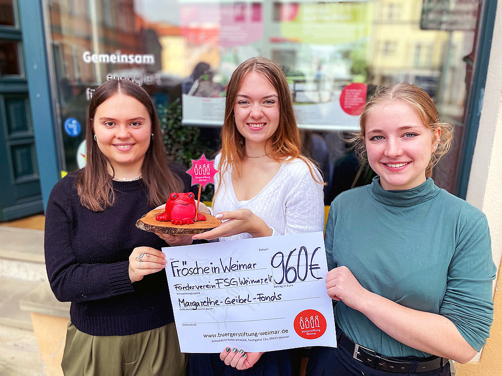 „Frösche in Weimar" ist ein Projekt von Elise Hofmann, Helene von der Gönna, Alva Reinhold und Alexandra Kirsch, das sie in der AG „Contemporary Art" von Herrn Renschin entwickelt haben. Die Frösche sollen den kleinen Besuchern von Weimar die Möglichkeit bieten, die Vielfalt der Kultur und der Wissenschaft, die Weimar aufweist, zu ergründen (mehr Informationen hier).