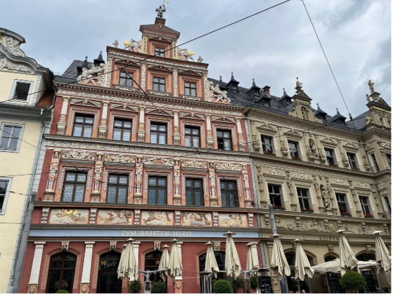 Der Fischmarkt ist auch heute noch ein zentraler Platz in Erfurt und schließt an den Benediktsplatz an. Also nur eine Gehminute von der Krämerbrücke entfernt. Am Fischmarkt stehen unter anderem das Rathaus, das Haus „Zum breiten Herd“ und das danebengelegene „Gildehaus“. Schaut man genau hin, erkennt man die fünf Sinne, dargestellt an der Fassade über dem Eingang. „Zum breiten Herd“ zählt zu den bekanntesten und prachtvollsten Häusern in Erfurt aus der Renaissancezeit und ist das Vorbild für den Bau des „Gildehauses“ gewesen.