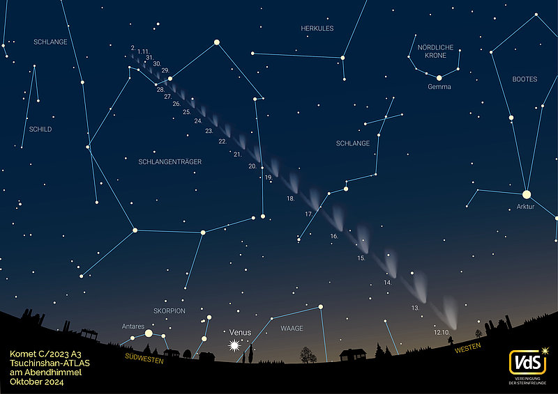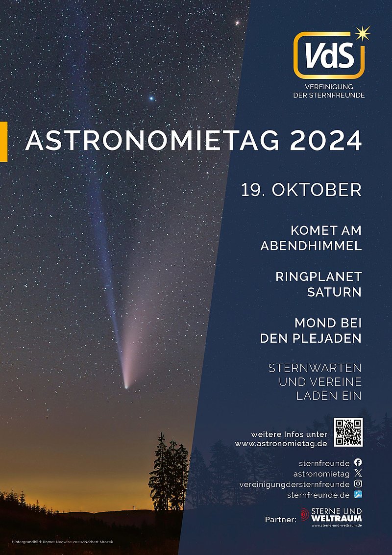 Die Veranstaltung findet im Rahmen des bundesweiten Tages der Astronomie statt und beginnt um 19.00 Uhr. Wir laden wieder dazu ein, die Welt der Sterne und Planeten mit den eigenen Augen zu erkunden – zur besten Sichtbarkeit des Ringplaneten Saturn, mit dem Mond in der Nähe der Plejaden und dem Kometen C/2023 A3 (Tsuchinshan-ATLAS) am Abendhimmel.