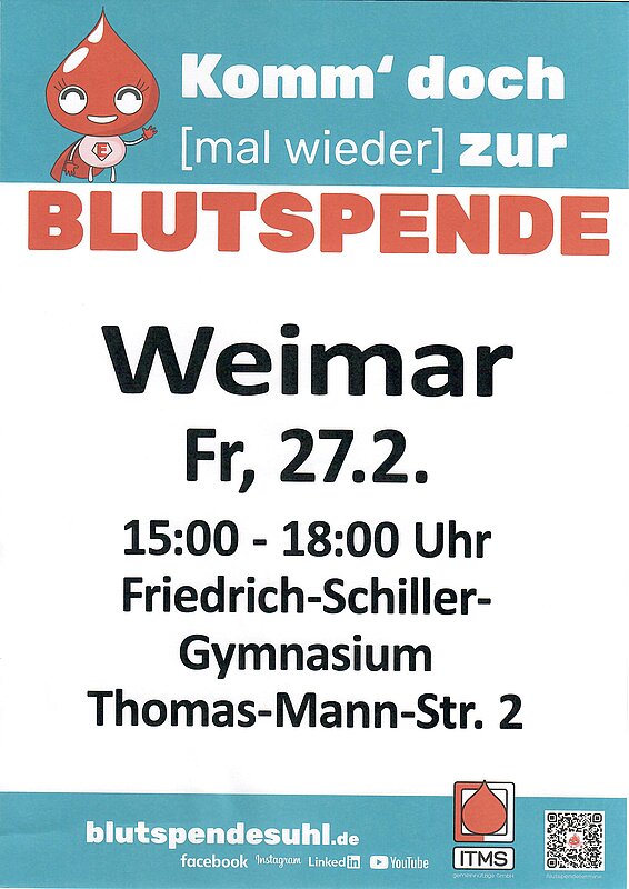 Am Freitag, den 27. Februar, verwandelt sich das Friedrich-Schiller-Gymnasium in Weimar (Thomas-Mann-Str. 2) in eine Lebensretter-Station. Von 15:00 bis 18:00 Uhr sind Sie und Ihr herzlich eingeladen, mit einer Blutspende einen wertvollen Beitrag für die Gemeinschaft zu leisten. Die 12er übernehmen das Catering vor Ort und sorgen für die nötige Stärkung nach der Spende. Dabei sammeln sie auch Spenden für ihren Abiball. Mit Ihrem Besuch unterstützen Sie also nicht nur Patienten in Not, sondern leisten auch einen Beitrag für eine unvergessliche Abschlussfeier unseres diesjährigen Abiturjahrgangs.