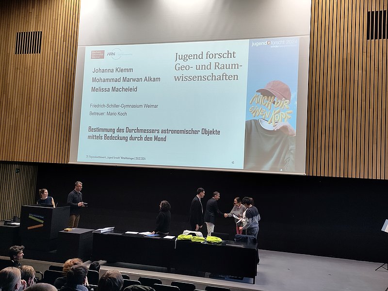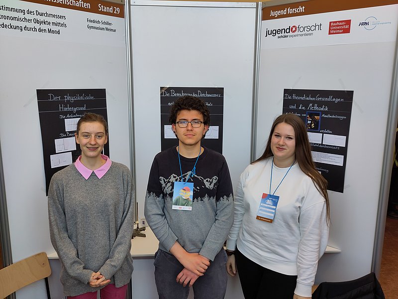 Auch zwei Teams unserer Schule stellten sich den kritischen Blicken der Jurys: Mit ihrem Projekt "Bestimmung des Durchmessers astronomischer Objekte mittels Bedeckung durch den Mond" erreichten Johanna Klemm, Mohammad Marwan Alkam und Melissa Macheleid den zweiten Preis im Bereich Geo- und Raumwissenschaften. Außerdem wurden sie mit dem Sonderpreis "bild der wissenschaft" - Jahresabonnement belohnt. Das Projekt "Windenergie - Untersuchung der Zukunftsfähigkeit und Vergleich mit fossilen Brennstoffen" von Leopold Landau, Paul Goldammer und Paulus Korn erreichte im Bereich Physik den dritten Platz.