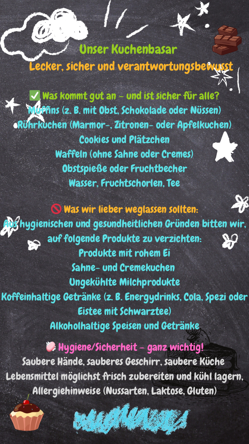 Für alle Klassen, die einen Kuchenbasar organisieren möchten, gibt es jetzt eine praktische Übersicht mit allem, was wichtig ist: Hinweise zu Allergenen, zur Hygiene und zur Sicherheit. - Einfach das Dokument hier öffnen, informieren und losbacken!