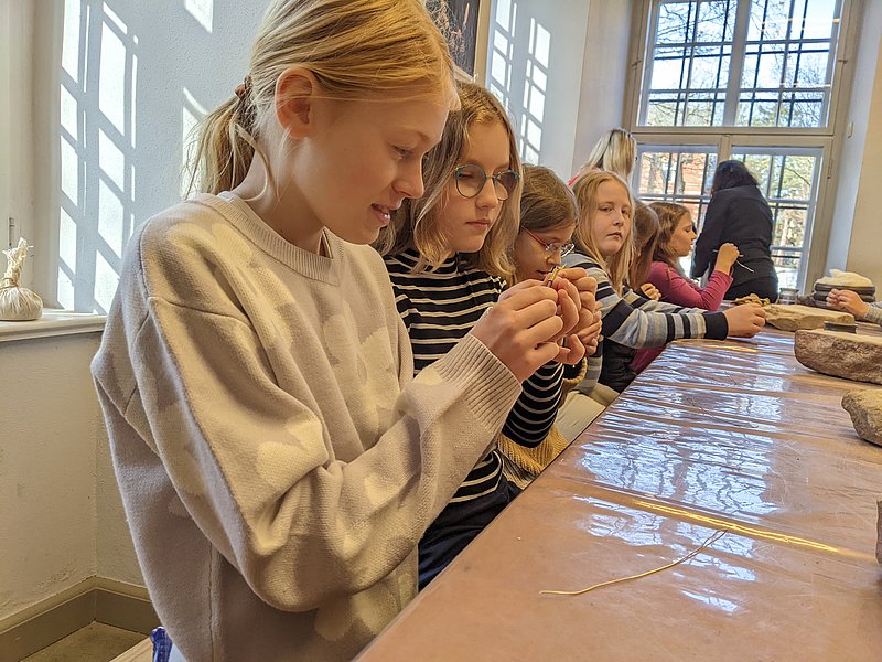 In einer Führung durch das Museum zur Jungsteinzeit und Bronzezeit konnten wir unser Wissen aus dem Geschichtsunterricht vertiefen. Wir schauten uns z.B. ein Langhaus an, konnten einen steinzeitlichen Webstuhl bestaunen und noch viel Neues erfahren, z.B. zur Salzgewinnung in der Bronzezeit in unserer Region. Zwischendurch haben wir auf dem Spielplatz die Sonne genossen und uns für den zweiten Teil gestärkt. Im anschließenden Workshop waren wir dann selbst als Künstler gefragt. Unter Anleitung haben wir bronzezeitlichen Schmuck mit echtem Bernstein hergestellt. Mit viel Geduld konnten tolle Armbänder oder Ketten gestaltet werden.
