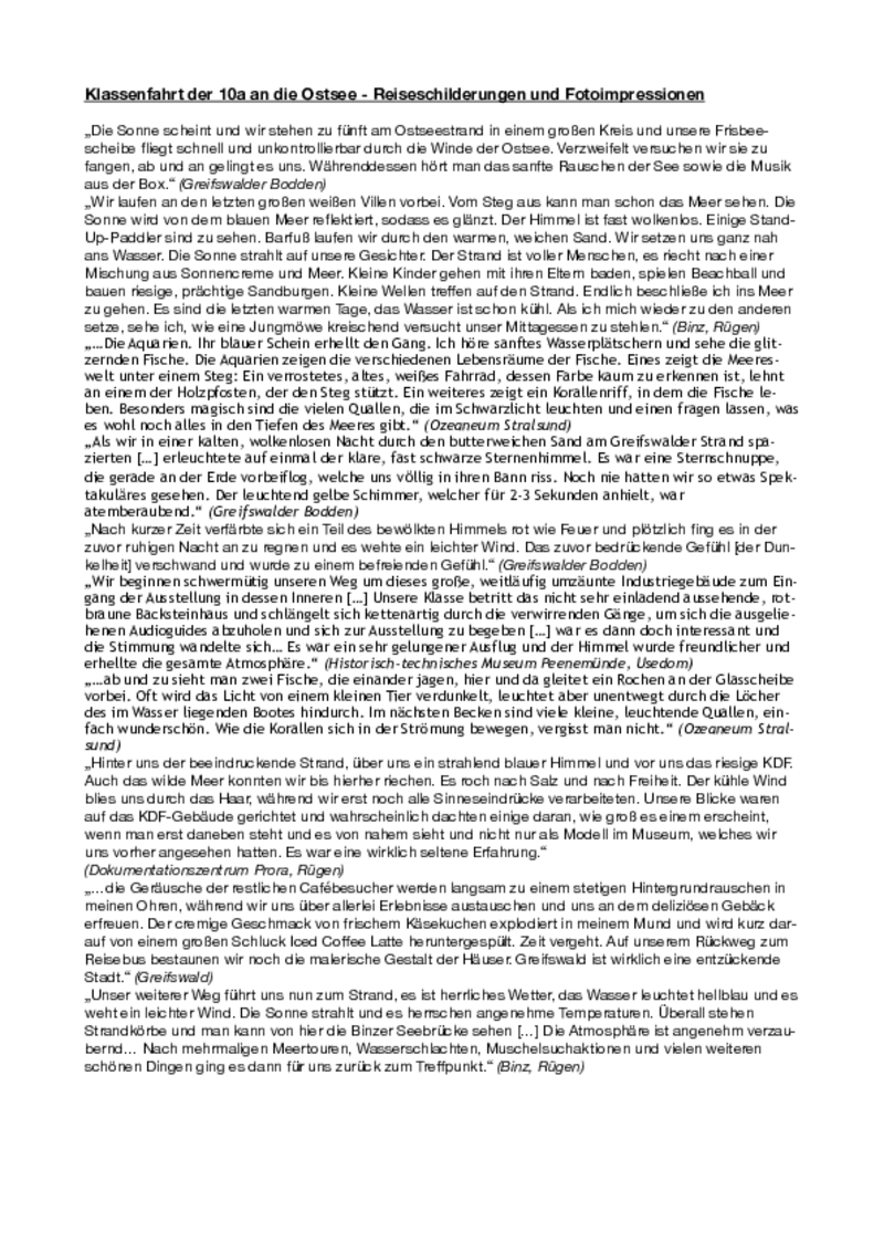„Unser weiterer Weg führt uns nun zum Strand, es ist herrliches Wetter, das Wasser leuchtet hellblau und es weht ein leichter Wind. Die Sonne strahlt und es herrschen angenehme Temperaturen. Überall stehen Strandkörbe und man kann von hier die Binzer Seebrücke sehen [...] Die Atmosphäre ist angenehm verzaubernd... Nach mehrmaligen Meertouren, Wasserschlachten, Muschelsuchaktionen und vielen weiteren schönen Dingen ging es dann für uns zurück zum Treffpunkt.“ (Binz, Rügen)