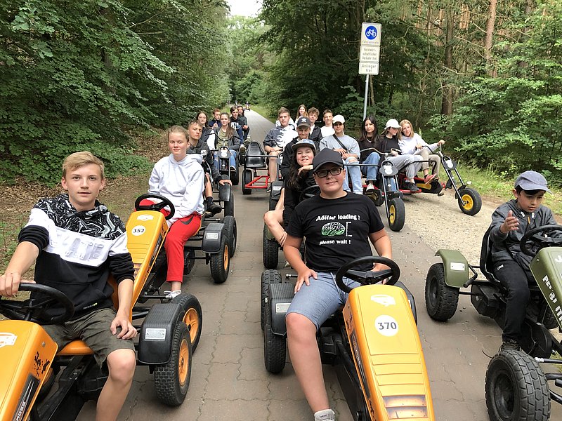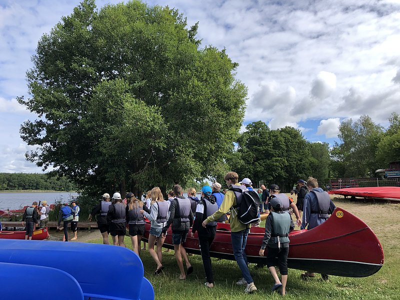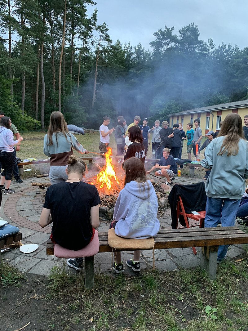 Am 04. Juli trafen wir uns um 7:45 Uhr am Parkplatz vor der Asbachhalle. Als der Bus eintraf, luden wir unsere Koffer ein und fuhren um kurz nach 8 Uhr Richtung Mirow. Auf der fünfstündigen Busfahrt machten wir zwei Pausen. Als wir ankamen, teilten wir die Zimmer ein. Später sind wir gemeinsam in die Stadt gegangen, um unser Mittagessen zu kaufen. Von Dienstag bis Mittwoch liehen wir uns Kanus, damit erkundeten wir, nach einer ausführlichen Einweisung, die Umgebung. Dienstagnachmittag machten wir eine Badepause am Stadtstrand. Nachdem wir am Mittwoch die Kanus zurückgegeben hatten, machten wir am Nachmittag eine Tour mit Go-Karts. An den Abenden spielten wir zusammen Beachvolleyball. Am Donnerstag machten wir eine einstündige Schifffahrt. Abends sammelten wir Feuerholz und grillten anschließend Marshmallows über dem Lagerfeuer. Am Freitag kam um 10:00 Uhr unser Bus und wir fuhren zurück nach Weimar.