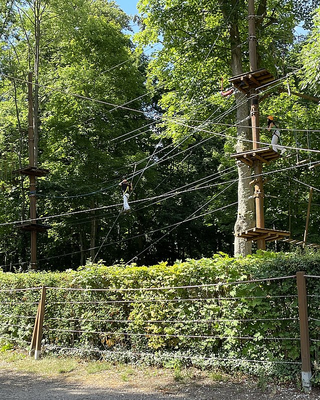 Vom 4.7. bis zum 8.7.2022 fand die Klassenfahrt der 6a statt. Die Anreise begann am Weimarer Hauptbahnhof. Wir fuhren mit dem Zug nach Sondershausen. Dort wurden wir mit einem Bus abgeholt und zum Possen gebracht. Von dort sind wir zum Bungalowdorf gelaufen und bezogen anschließend unsere jeweils zugeteilten Bungalows und Zimmern. Am Nachmittag besuchten wir den dortigen Hochseil- bzw. Klettergarten. Der Klettergarten war in 3 verschiedene Höhenstufen eingeteilt.