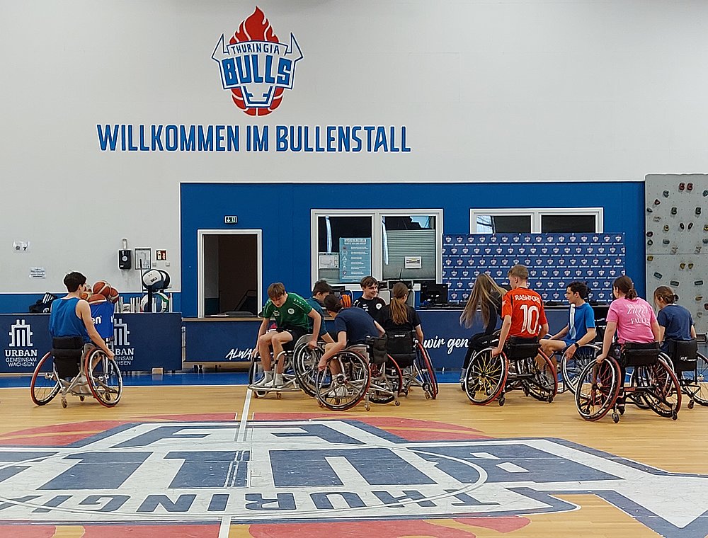 Unseren Gewinn haben wir am Samstag im „Bullenstall“ in Elxleben (bei Erfurt) eingelöst. Dort trafen wir den Trainer der Bulls, André Bienek. Zunächst gab es in der Wettkampfhalle für uns eine Einführung in Form eines Parcours mit Alltagsrollstühlen. Wir lernten, dass z.B. Kopfsteinpflaster, Treppen oder Bordsteinkanten im Alltag eines Rollstuhlfahrers Probleme bereiten und zu meisternde Hindernisse sind. Dann hatten wir noch ein kurzes Training mit speziellen Sportrollstühlen für Basketball. Hier sind die beiden Laufräder schräg gestellt und weitere Rollen unterstützen die Stabilität und Wendigkeit. Die Beine schnallt man fest. Zum Abschluss gab es mit dem Trainer André viel Spaß und einige gelungene Körbe beim Rollstuhlbasketball auf dem großen Spielfeld!