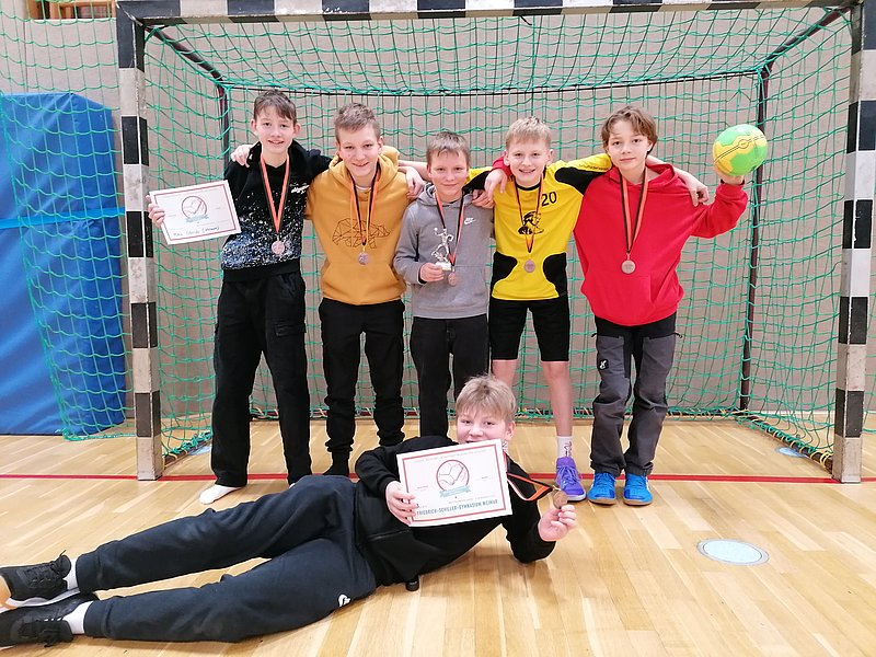 Mit dem Gewinn des Stadtfinals in Weimar qualifizierte sich unsere U16 für das Schulamtsfinale am 09.01.25 in Apolda. Unsere Gegner waren Schulen aus Kölleda, Erfurt und Kranichfeld. Aufgrund verschiedener Umstände mussten unsere Jungs leider in Unterzahl spielen. Dies schien aber Motivation genug zu sein und so erkämpften unsere Handballer im ersten Spiel gegen Kölleda ein Unentschieden. Dem späteren Zweitplatzierten aus Kranichfeld mussten sich die Jungen im zweiten Turnierspiel nur knapp, mit einem Tor, geschlagen geben. Im abschließenden Spiel gegen Erfurt überzeugten die Jungs vom FSG erneut und holten sich trotz langem Rückstand das zweite Unentschieden, wodurch der 3. Platz gesichert werden konnte. Die Schule aus Kölleda gewann das Schulamtsfinale und vertritt Mittelthüringen im kommenden Landesfinale – Herzlichen Glückwunsch und viel Erfolg. Besonders hervorzuheben war das faire und sportliche Auftreten unserer Jungen, die durch Spielfreude, handballerische Finesse, Teamgeist und Zusammenhalt Lehrer*innen, Schiedsrichter*innen und Gegenspieler auf ganzer Linie überzeugen konnten. Mit Mika Erbrich (Klasse 8B) stellte unsere Schule außerdem den besten Spieler des Turniers – Herzlichen Glückwunsch Mika zu dieser herausragenden Leistung.