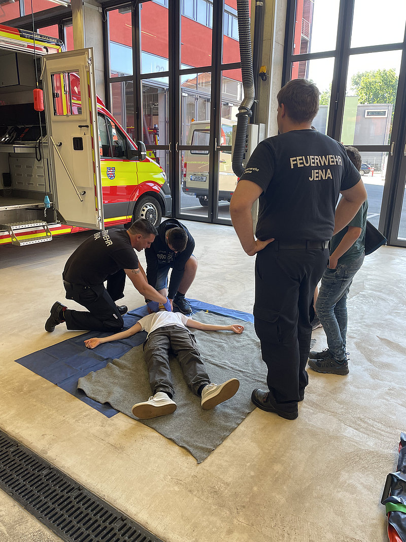 Die Schulsanitäter-AG hat sich mit unserem Lehrer Herrn Wiegand vor dem Weimarer Hauptbahnhof getroffen, um mit dem Zug zur Berufsfeuerwehr Jena zu fahren. Als wir dann bei der Feuerwehr angekommen waren, stand dort unsere SSG-Leiterin Frau Burschil.
