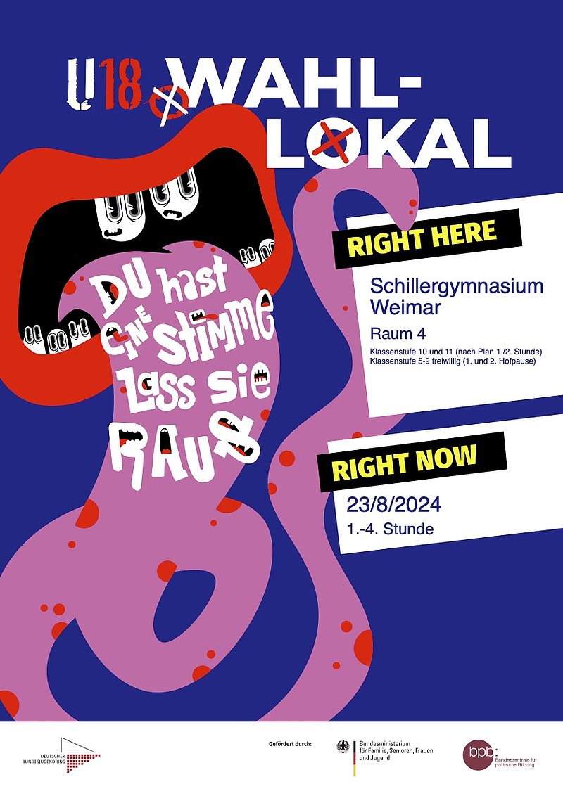 am Freitag, dem 23.8., nehmen wir an der U18-Wahl zur Thüringer Landtagswahl 2024 teil. Nutzt eure Stimme. Die Klassenstufen 10 und 11 gehen in der 1. und 2. Stunde verbindlich wählen. Alle anderen Klassenstufen dürfen in der 1. und 2. Hofpause wählen. Macht den Unterschied und geht wählen.