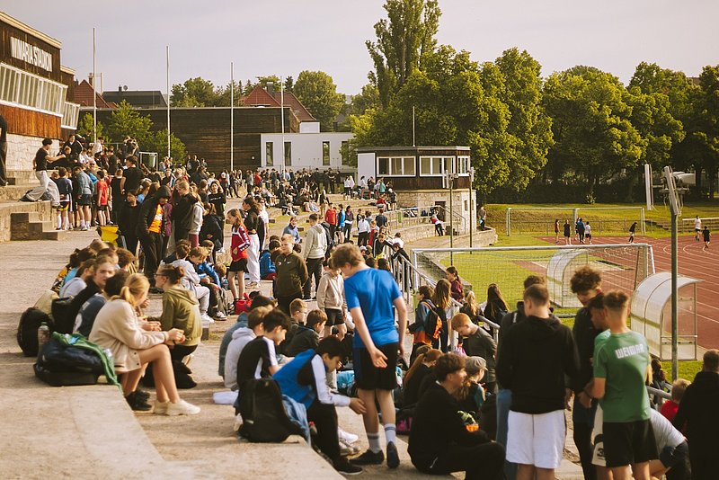 Bei angenehm warmem Wetter und leicht bedecktem Himmel fand das alljährliche Sportfest des Friedrich-Schiller-Gymnasiums im Wimaria-Stadion Weimar statt. Schon um 7:45 Uhr versammelten sich alle Schülerinnen und Schüler erwartungsvoll auf den Tribünen, während auf dem Gelände letzte Vorbereitungen getroffen wurden: Fußballtore wurden aufgebaut, Stationen eingerichtet und Materialien verteilt.